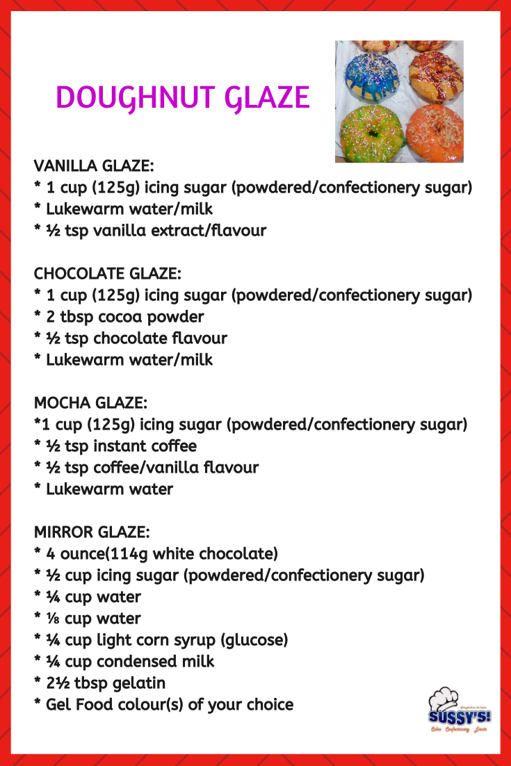 As promised last week, I said I will be sharing the recipe for the four different glazes I used to coat my ring doughnuts, so here we are! If you missed the ring doughnuts recipe, don’t worry the link is right here 👇