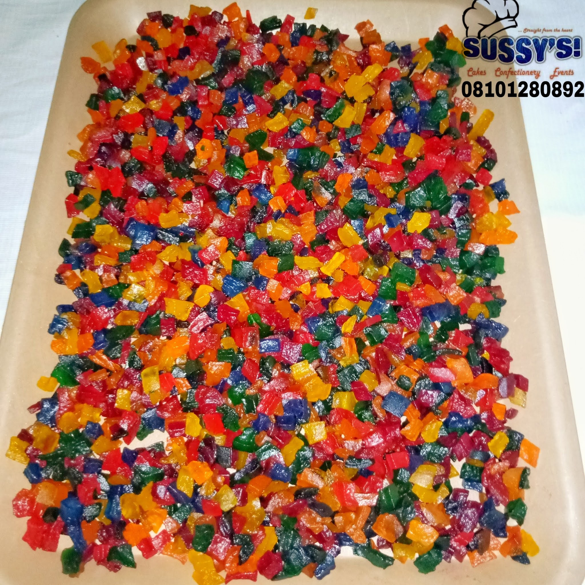 Tutti Fruttis are sweet and colourful confectioneries, or candied fruits mainly prepared from raw pawpaw (papaya) or from watermelon rind. It is often used for toppings in ice creams, desserts, or made with a cake or bread recipe.