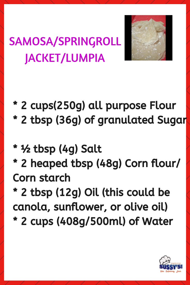 It is believed that spring rolls originated from China, while Samosa was birthed in Central Asia and the Middle East. To make a perfect Samosa or Spring roll, you have to first master how to prepare the jackets. This is where a lot of people gets stucked either with wrong recipes which yields wrong jackets; or wrong heat level which also spoils the jackets. So here is a NO FAIL recipe. You don’t need a samosa maker/machine. It’s very simple to make. Just follow the step by step video and you will be a boss at making your jackets!