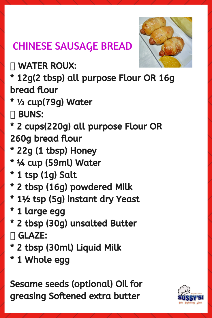 I promised that all my recipes will be very simple and materials accessible, now this is just me fulfilling my promise! These sausage bread are super soft, and it strikes a balance between sweet and savory! They could be eaten plain or alongside some ketchup or mustard. What makes these sausage bread super soft? Water Roux. This is simply a mixture of water/liquid milk ➕ flour cooked to form a thick glossy paste on low heat. It yields a soft and fluffy bread. Another plus to the recipe is the presence of Honey. It’s no news that honey, once added to a recipe creates extra moisture! I have seen several pictures of sausage breads and many of them have their sausages swallowed up in the buns. This isn’t meant to be so. It looks more pretty with the sausages displaying at both end. So what’s the trick? # PROOF ONLY ONCE! Yes, that’s the trick to my perfect sausage bread. I don’t reproof before baking. # During cold seasons, use lukewarm water. If your index finger hurts when you insert it into the water, it’s not lukewarm. During hot seasons use normal tap water. Sometimes I use cold water from the fridge! # During cold seasons yeast raised doughs takes longer time to proof. So keep them wrapped in the warmest part of your bakery or kitchen. # Preheat your oven 15 minutes to the end of proofing time. # Don’t flour your work surface, grease instead, as using flour will add more flour to the dough, resulting to a dense buns.